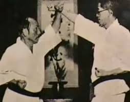 An angular deflection, of the type Age Uke, here demonstrated by Gichin Funakoshi.Absorbing impact using a high, closed guard. Image from Expert Boxing
